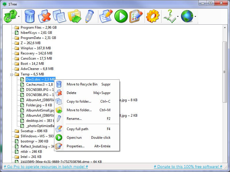 1Tree est un programme très simple qui affiche les fichiers et dossiers sur toutes vos partitions et lecteurs réseau, ainsi que la quantité d'espace qu'ils occupent. Ainsi, lorsque vous affichez toutes ces informations dans une fenêtre, affichée dans une arborescence simple, il est beaucoup plus facile d'avoir une meilleure idée de ce qui peut et doit être supprimé. Vous pouvez effectuer alors les opérations par action sur les boutons de la barre d'outils ou les éléments du menu contextuel, comme Déplacer vers Corbeille, Supprimer définitivement, Copier vers, Renommer, Déplacer vers, Copier le chemin complet, Exécuter, Ouvrir et afficher la propriété.