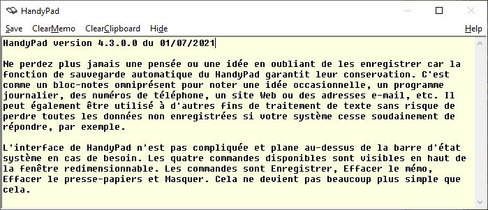 - Le fichier texte HandyPad.txt contenant toutes vos données et mémos se situe dans le dossier d'origine de HandyPad :