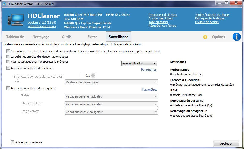 > Surveillance : réglage des performances, optimisation mémoire, surveillance système et navigateur ... etc . :